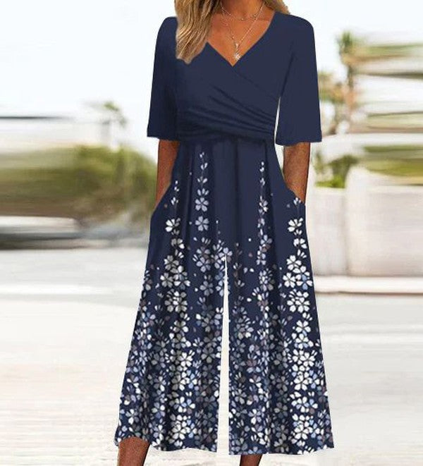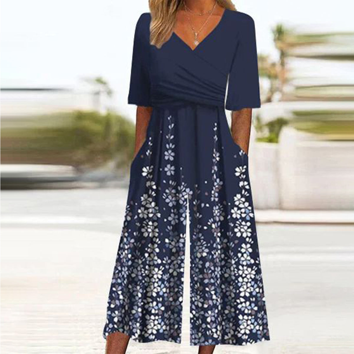 This navy blue jumpsuit is the perfect addition to your wardrobe. Featuring short sleeves and convenient side pockets, this versatile outfit can easily be dressed up or down for any occasion. Made from high-quality materials, it offers both comfort and style. Upgrade your fashion game with this must-have jumpsuit.